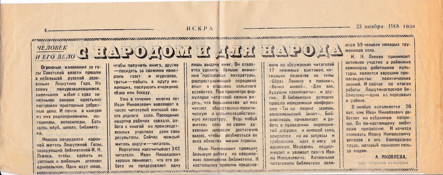 Левков И. В библиотеке отличной работы / И. Левков // Искра. – п. Чагода, 1967. – 5 января. – С. 3.
