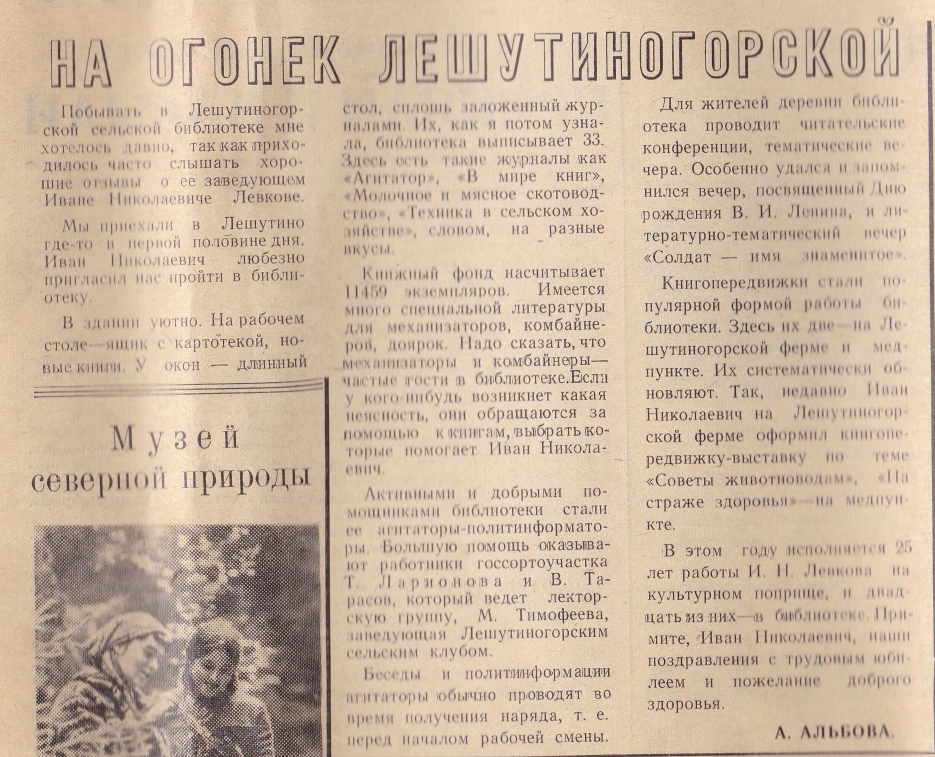 Альбова А. На огонёк Лешутиногорской / А. Альбова // Искра. – п. Чагода, 1973. – 4 сентября. – С. 4.