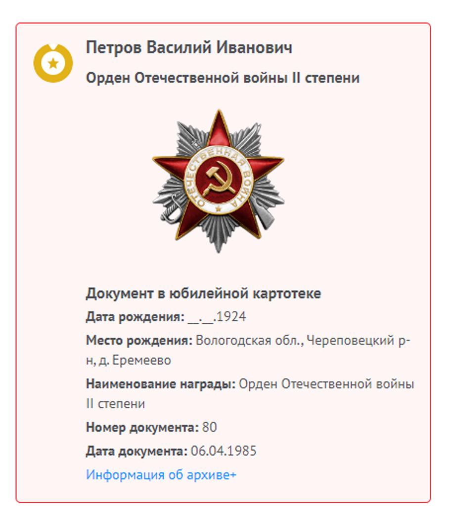 Василий Иванович Петров родился 3 февраля 1924 г. в деревне Еремеево Череповецкого района в семье крестьянина-середняка. В 1942 г. окончил Абакановскую школу и осенью был призван в Красную Армию. Воинскую службу проходил на Волховском и 1-м Прибалтийском фронтах. Демобилизован по состоянию здоровья в январе 1945 г. (имел группу по инвалидности). Награжден медалью «За победу над Германией», орденом Отечественной войны II степени.