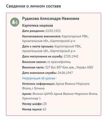 Рудакова Александра Ивановна на сайте «Память народа»