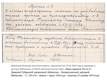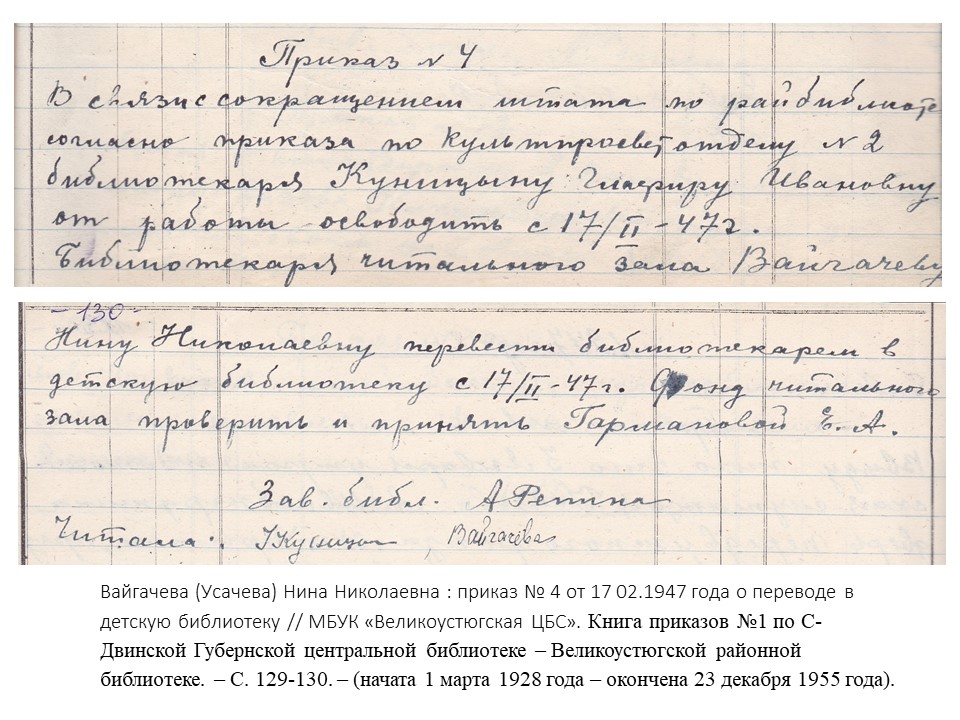 Усачева (Вайгачева) Нина Николаевна : личное дело // МБУК «Великоустюгская ЦБС». Дело на зав. абонементом районной библиотеки1945-1981 : архив библиотеки. – Содерж. : Листок по учету кадров, автобиография, характеристика. – 12 л.