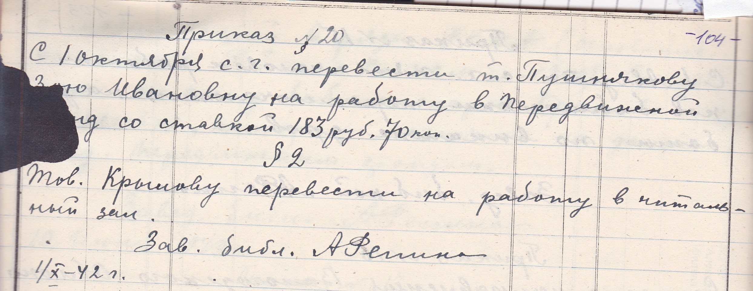 Юферицына (Пушнякова) Зоя Ивановна : приказ № 20 от 01.10.1942 года : о переводе в передвижной фонд // МБУК «Великоустюгская ЦБС». Книга приказов №1 по С-Двинской Губернской центральной библиотеке – Великоустюгской районной библиотеке (начата 1 марта 1928 года – окончена 23 декабря 1955 года) – С. 104.