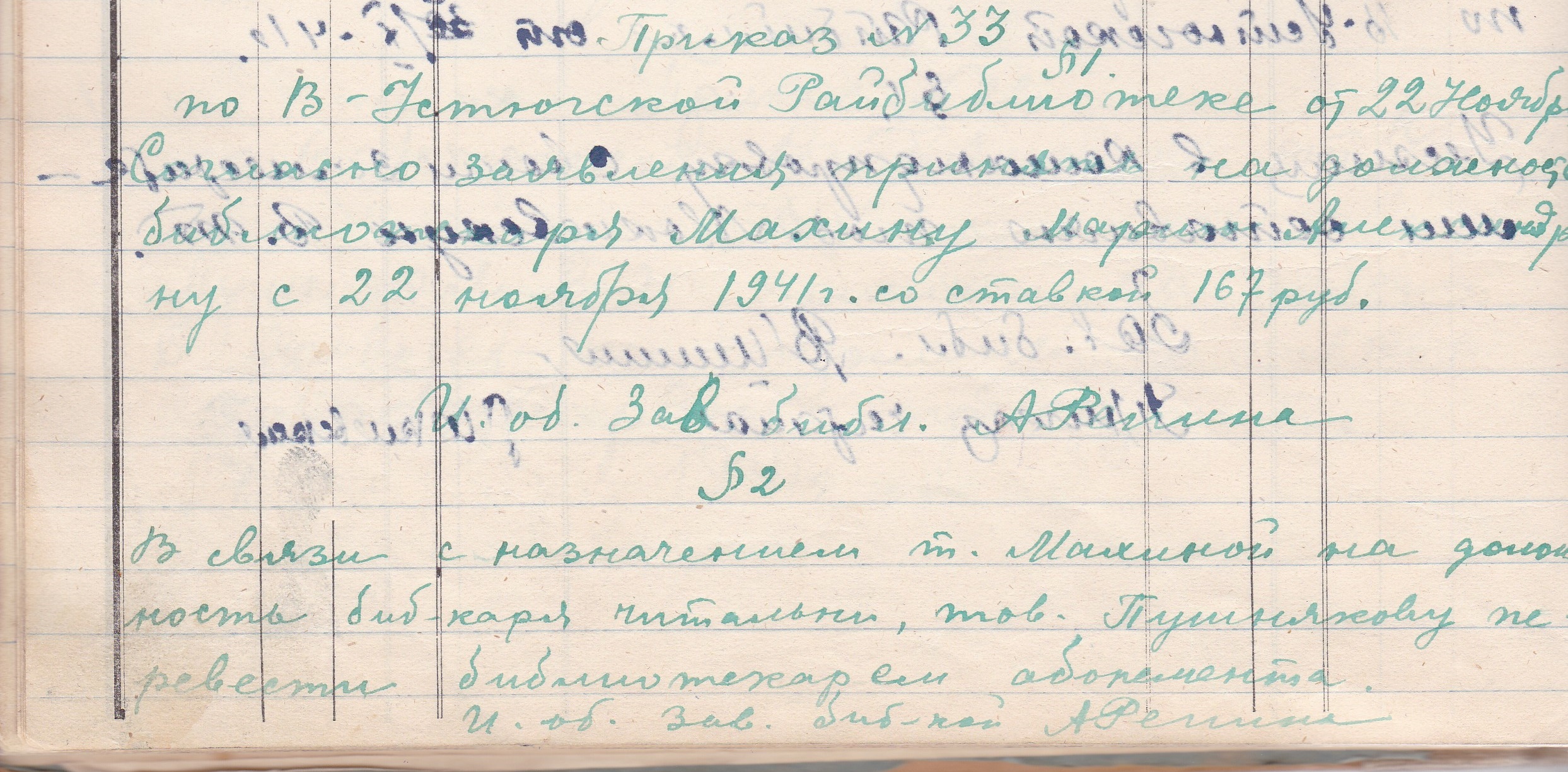 Юферицына (Пушнякова) Зоя Ивановна : приказ № 2 от 3.04.1944 года : о переводе в распоряжение РайОНО // МБУК «Великоустюгская ЦБС». Книга приказов №1 по С-Двинской Губернской центральной библиотеке – Великоустюгской районной библиотеке (начата 1 марта 1928 года – окончена 23 декабря 1955 года) – С. 109.