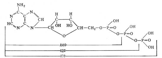 Аденозинфосфорные кислоты, нуклеотиды, моно-, ди- и трифосфорные эфиры аденозина, содержащие аденин, углевод рибозу и один (АМФ), два (АДФ) или три (АТФ) остатка фосфорной кислоты. А. к. имеются во всех организмах (от микроба и растения до человека) и играют важнейшую роль в обмене веществ и энергий, т. к. присоединение фосфатных групп к АМФ сопровождается аккумуляцией энергии (АДФ, АТФ — макроэргические соединения), а их отщепление — выделением энергии, используемой для различных процессов жизнедеятельности (см. Биоэнергетика). В клетках постоянно происходят взаимопревращения АТФ, АДФ и АМФ. Аденозинмонофосфорные кислоты (АМФ, адениловые кислоты) имеют один остаток фосфорной кислоты. Молекулярная масса 347,23. В зависимости от места присоединения остатка фосфорной кислоты к рибозе различают 5’-АМФ («мышечная» АМФ), 3’-АМФ («дрожжевая» АМФ) и 2’-АМФ. АМФ — составная часть нуклеиновых кислот, входит в состав многих ферментов. Основные производные АМФ: циклическая АМФ, активирующая фермент фосфорилазу, и АТФ. Аденозиндифосфорная кислота (АДФ) имеет 2 остатка фосфорной кислоты. Молекулярная масса 427,22. Получается из АТФ при ферментативном отщеплении остатка фосфорной кислоты. Играет большую роль в энергетическом обмене и окислительном фосфорилировании. Аденозинтрифосфорная кислота (АТФ, аденилпирофосфорная кислота) имеет 3 остатка фосфорной кислоты. Молекулярная масса 507,21. Является субстратом для биосинтеза нуклеиновых кислот. Одна или две концевые фосфатные группы легко отщепляются от АТФ под действием ферментов аденозинтрифосфатаз; при этом образуются АДФ или АМФ и освобождается энергия (30—40 кдж, или 7—10 ккал, в расчёте на один фосфат). Присоединение остатков фосфорной кислоты к АМФ или АДФ сопровождается накоплением энергии в образующейся АТФ. При переносе легко отщепляющихся богатых энергией (макроэргических) фосфатных групп с АТФ на др. вещества эта энергия передаётся последним или расходуется на мышечное сокращение, нервное возбуждение, секрецию желёз, биосинтез белков и иных веществ и др. Ресинтез АТФ происходит в процессе окислительного, фотосинтетического или сопряжённого с гликолизом фосфорилирования или связан с др. энергетическими процессами.