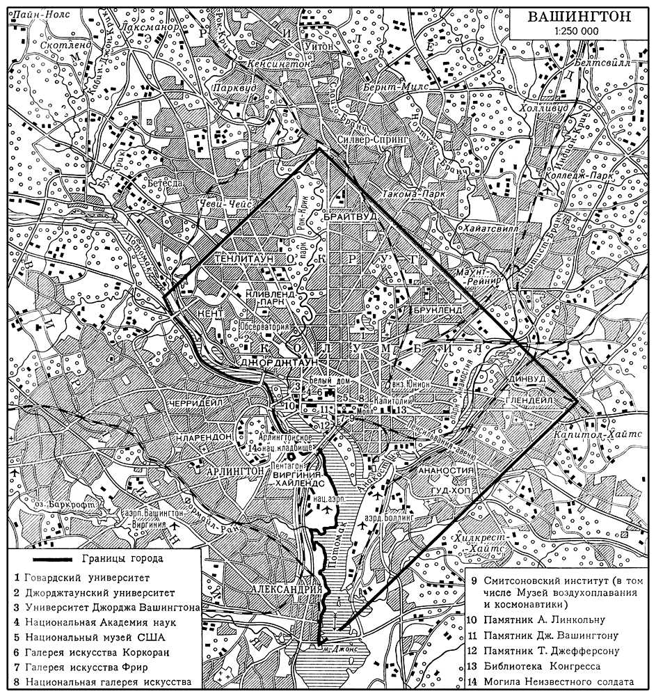 Архитектура. План В. был составлен в 1790—93 французским инженером П. Ш. Ланфаном при участии просветителя и государственного деятеля Т. Джефферсона: прямоугольная сетка улиц (стрит) дополняется диагональными проспектами (авеню), в том числе лучами, сходящимися к зданию конгресса — Капитолию (1793—1865, архитекторы У. Торнтон, Б. Латроб, Т. Уолтер). К широкой парковой магистрали Молл, ведущей от Капитолия к р. Потомак, примыкает парк с Белым домом (1792—1829, архитекторы Дж. Хобан, Б. Латроб). В архитектуре правительственных зданий, посольств, миссий и др., сосредоточенных в северо-западном районе, преобладают влияния европейского классицизма. Высота зданий в В. ограничена (они не должны быть выше Капитолия). В. — одна из самых озеленённых столиц мира (площадь парков около 2800 га). Важнейшие памятники: Дж. Вашингтону (1848—84, архитектор Р. Миллс), А. Линкольну (1914—22, архитектор Г. Бэкон), Т. Джефферсону (1939—41, архитектор Дж. Р. Поуп, О. Р. Эггерс, Д. П. Хиггинс). На Ю.-З. города — речной порт, склады, на С.-В. и Ю.-В. — городские трущобы, где живут, главным образом, бедные слои населения, в основном негры. В пригородах — богатые виллы и коттеджи. В Арлингтоне, на правом берегу р. Потомак, — Пентагон и Национальное кладбище с могилой Неизвестного солдата. В последние десятилетия построены жилые районы на С.-З. в Джорджтауне и на Ю.-З., правительственные и деловые здания (Налоговый суд США, 1967, архитектор В. Ланди; Управление жилищного и городского строительства, 1968, архитектор М. Брёйер, Х. Бекхард), театральный центр им. Дж. Кеннеди и др.; за пределами В. в штате Виргиния — международный аэропорт им. Даллеса в Шантийи (1958—1962, архитектор Эро Сааринен) и город-спутник Рестон (1963—65, архитектор. Уитлеи и Конклин).