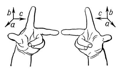 Для определения векторного произведения векторов нужно понятие левой и правой упорядоченной тройки векторов. Упорядоченная тройка векторов а, b, с (а — первый вектор, b — второй, с — третий), приведённых к общему началу и не лежащих в одной плоскости, называется правой (левой), если они располагаются так, как могут быть расположены соответственно большой, несогнутый указательный и средний пальцы правой (левой) руки. На рис. 6 изображены справа — правая, а слева — левая тройки векторов.