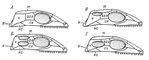 Рис. 1. Схема височных дуг пресмыкающихся: А — анапсидный череп: Б — диапсидный череп; В — парапсидный череп; Г — синапсидный череп; згл — заглазничная кость; ск — скуловая; т — теменная; ч — чешуйчатая; кс — квадратноскуловая; к — квадратная.