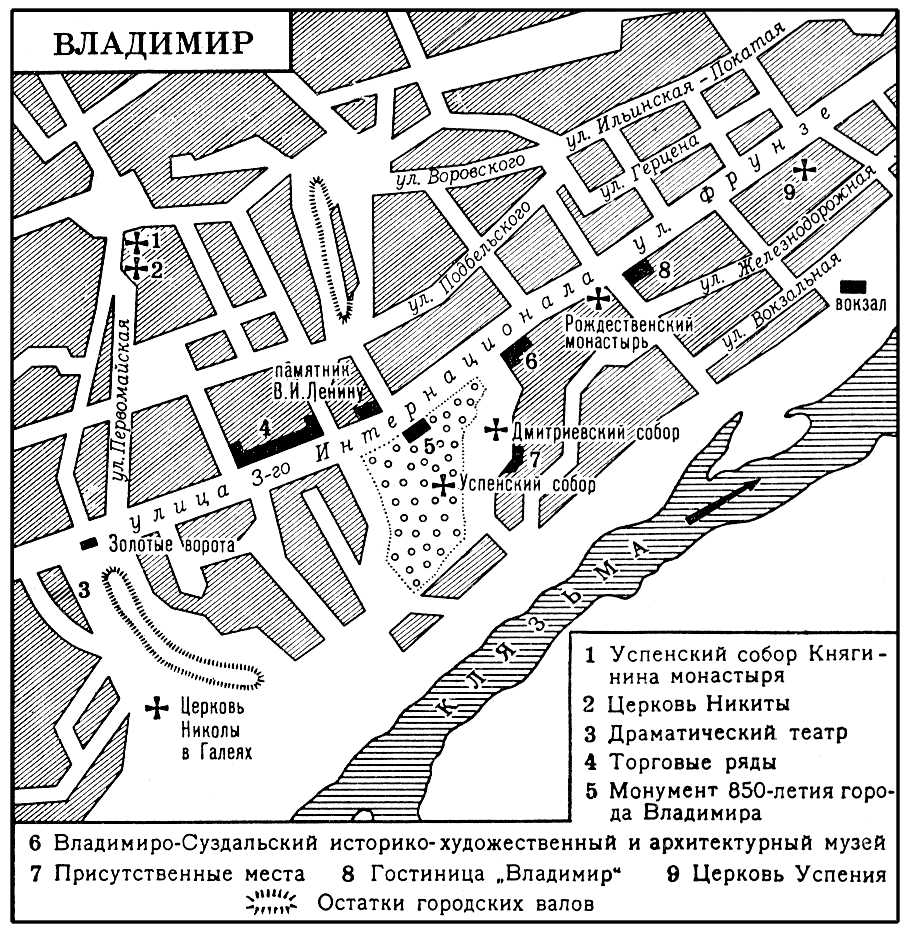 Владимир, город, центр Владимирской области РСФСР. Расположен в центральной части Восточно-Европейской равнины, на левом берегу р. Клязьма. Узел автомобильных и железных дорог (линии на Москву, Горький, Рязань) в 190 км к С.-В. от Москвы. Население 234 тыс. чел. (1970; 40 тыс. в 1926; 67 тыс. в 1939; 154 тыс. в 1959).