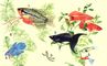 Рыбы: 1 — жемчужный гурами; 2 — флаговый меченосец; 3 — молинезия лира; 4 — бойцовая рыбка; 5 — гуппи. Аквариумные растения: 6 — мириофиллюм; 7 — людвигия.