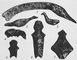 Костяные и каменные фигурки с Волосовской стоянки: 1 — голова лебедя; 2, 3 — изображения птиц; 4 — изображение животного; 5, 6, 7 — изображения человека.