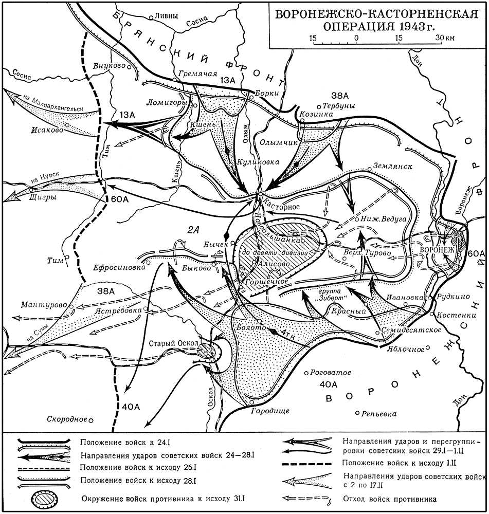 Воронежско-Касторненская операция 1943, наступательная операция, проведённая 24 января — 17 февраля главными силами Воронежского (генерал-полковник Ф. И. Голиков) и 13-й армией Брянского (генерал-полковник М. А. Рейтер) фронтов во время Великой Отечественной войны 1941—45. После разгрома противника в Острогожско-Россошанской операции 1943 в немецкой обороне образовалась 220-км брешь от Старого Оскола до Сватово, что создало условия для удара во фланг и тыл 2-й немецкой армии, оборонявшей вместе с 3-м венгерским корпусом (10 немецких и 2 венгерские дивизии; 125 тыс. чел., 2100 орудий и миномётов, 65 танков) воронежско-касторненский выступ (основание — 130 км, глубина — около 100 км). Оборона противника была наиболее развита на северном и восточном участках выступа; его южный фас был укреплён слабее и оборонялся группой из остатков разбитых соединений. Операция началась 24 января ударом 40-й армии, усиленной 4-м танковым корпусом, в направлении на Горшечное, Касторное. 25 января в бои вступила 60-я армия, которая полностью освободила Воронеж и развернула наступление на Нижнюю Ведугу. 25 января в наступление перешли войска 38-й, а 26 января — 13-й армий в общем направлении на Касторное, а частью сил на Нижнюю Ведугу. Немецко-фашистское командование вечером 25 января начало отвод своих войск, но 28 января ударные группировки 40-й, 13-й и 38-й армий соединились в районе Касторное, перехватив пути отхода на З. войск 2-й немецкой армии. Одновременно часть сил 13-й и 40-й армий вела наступление на З. с целью создания внешнего фронта окружения. К исходу 30 января была разгромлена часть сил окружённой группировки врага южнее Нижней Ведуги, а её основные силы зажаты в районе Новоольшанка, Алисово, Горшечное, Старый Оскол. Противник предпринимал отчаянные попытки прорваться из окружения. В ожесточённых боях, продолжавшихся до 17 февраля, окружённая группировка была разгромлена войсками 38-й армии. 9 вражеских дивизий потеряли 2/3 своего состава, почти всё тяжёлое вооружение и технику. В результате В. -К. о., проведённой в условиях суровой и многоснежной зимы, советские войска нанесли тяжёлое поражение 2-й немецкой армии и 3-му венгерскому корпусу. Было разгромлено до 11 дивизий (9 немецких и 2 венгерские), захвачено много военного имущества. Советские войска освободили большую часть Воронежской и Курской областей, выдвинулись на рубеж рек Тим и Оскол и создали условия для проведения последующих наступательных операций на курском и харьковском направлениях.
