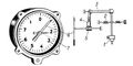 Общий вид и схема авиационного механического акселерометра: 1 — грузик маятника, отклоняющийся под действием ускорения; 2 — пружина; 3 — ось; 4 — зубчатый сектор; 5 — зубчатое колесо; 6 — стрелка; 7 — стрелка, фиксирующая максимальное значение ускорения.