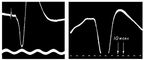 Рис. 2. Распределение вызванных потенциалов на свет по областям полушарий: пункты 1—7 (запись на чернилопишущем электроэнцефалографе). Вертикальная линия на электроэнцефалограмме — отметка раздражения. Отклонение пера вверх — усиление электроотрицательности.