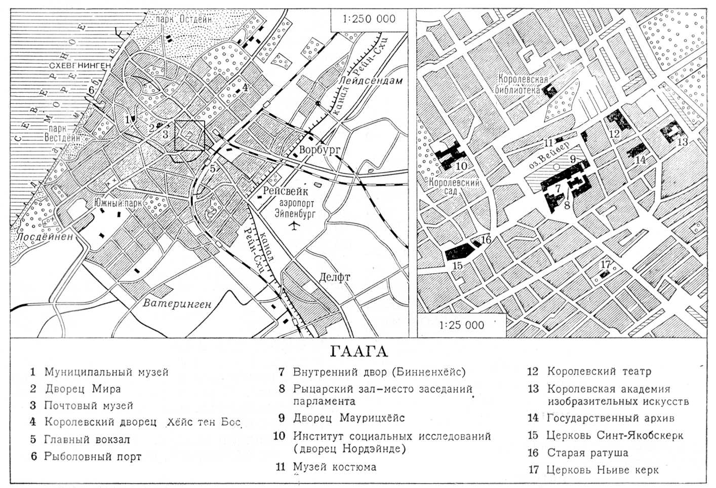Гаага (’s-Gravenhage, буквально — графская изгородь, реже Den Haag), город в Нидерландах, резиденция королевского двора и правительства. Административный центр Южной Голландии. Население городской агломерации Г. 728,1 тыс. жителей (1969); фактически с Г. слился морской курорт и рыболовецкий порт Схевенинген на берегу Северного моря. Г. — транспортный узел. Сеть каналов, автомобильных и железнодорожных путей связывает его с портом Роттердама в низовьях Рейна, с официальной столицей Амстердам и другими городами страны. Г. — в основном административно-политический центр. Однако в послевоенный период Г. приобретает значение важного экономического центра. В Г. сосредоточены крупные промышленные предприятия радио- и телеаппаратуры, электронного оборудования, телефонной и телеграфной аппаратуры; в пригороде — аэропорте Эйненбург размещаются авиационные заводы «Фоккер». Широко представлена пищевая (кондитерские изделия и др.) и лёгкая промышленность. Изготовление художественных изделий из дерева, стекла и др. В Г. сосредоточены правления многих торговых и промышленных фирм; многочисленны учреждения сферы обслуживания. Экономически активное население Г. по основным отраслям деятельности распределялось следующим образом (1969): в промышленности и ремесле — 56 тыс. чел., в сфере услуг — 107 тыс. чел. (в том числе в банках, торговле и страховом деле — 62 тыс. чел., на транспорте и в связи — 17 тыс. чел), на административной и государственной службе — 58 тыс. чел. (в том числе на государственной — 37 тыс.), в сельском хозяйстве и рыболовстве — 2,4 тыс. чел. В Г. находятся научные общества, государственный архив и библиотека; Королевская академия изобразительных искусств. Музеи: Маурицхёйс (Королевский кабинет картин), Муниципальный (искусство 19—20 вв.), Почтовый, костюма, Международный музей прессы. Г. — местопребывание Международного суда.