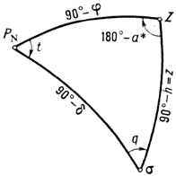 Соединив на небесной сфере (рис.) полюс PN, зенит места Z и наблюдаемое светило а дугами больших кругов, получим т. н. параллактический треугольник PNZs, в котором угол при вершине Z есть дополнение азимута а* светила до 180° и угол при вершине PN равен часовому углу t светила.