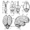 Рис. 2. Постепенное усложнение головного мозга у позвоночных животных (вид мозга сверху): А — мозг акулы; Б — лягушки; В — аллигатора; мозг млекопитающих: Г — тупайи; Д — лошади; Е — человека (вид сбоку). 1 — обонятельная доля; 2 — обонятельная луковица; 3 — эпифиз; 4 — третий желудочек; 5 — зрительная доля; 6 — мозжечок; 7 — продолговатый мозг; 8 — межуточный мозг; 9 — четвёртый желудочек; 10 — большие полушария; 11 — извилина; 12 — борозда.