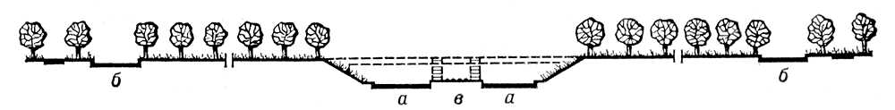 Рис. 2. Поперечный профиль городской дороги в выемке: а — проезжие части для скоростного движения автомобилей; б — то же для местного движения; в — пути скоростного трамвая на обособленном полотне.