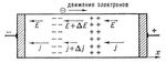 Рис. 3. Развитие электрического домена. Электроны движутся слева направо, против поля Е.