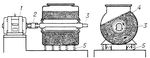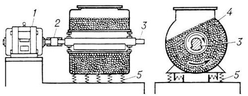 Рис. 6. Вибрационная мельница: 1 — электродвигатель; 2 — эластичная муфта; 3 — вал с дебалансом; 4 — барабан; 5 — пружины.