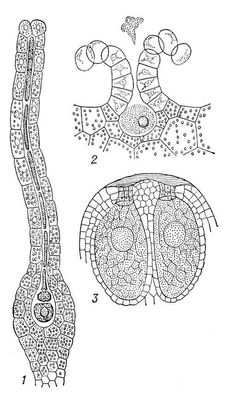 Архегоний: 1 — у мха; 2 — у папоротника; 3 — два архегония у сосны.