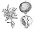 Гранат: ветка с цветками и плод (внизу — в разрезе).
