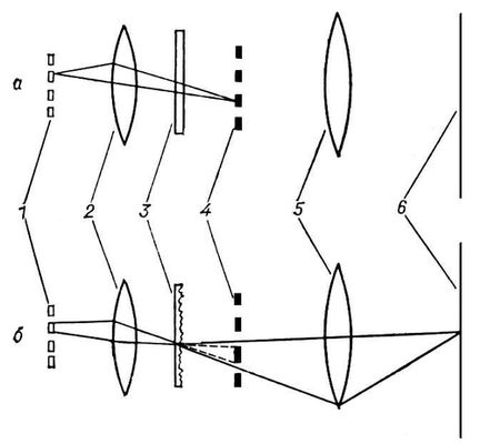 Рис. 2. Схема воспроизведения изображения при черно-белой термопластической записи, иллюстрирующая прохождение световых лучей через неэкспонированный участок плёнки (а) и участок с рельефным изображением (б): 1 — щелевые источники света; 2 — конденсор; 3 — плёнка; 4 — непрозрачные заслонки; 5 — объектив; 6 — экран.