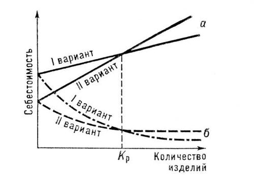 Рис. 7. График зависимости себестоимости продукции от годового выпуска: а — себестоимость годового выпуска, б — одного изделия, при разных вариантах технологического процесса; Кр — критическое количество изделий, при котором оба технологических варианта равноценны. С помощью этого графика устанавливаются условия, при которых каждый из вариантов технологического процесса наиболее экономичен. При плане выпуска, меньшем К, II вариант процесса потребует меньше затрат и даст более низкую себестоимость изделий.