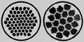 Рис. 1б. Поперечное сечение многожильного комбинированного проводника с 61 нитью (слева) и 1045 нитями (справа) в медной матрице.