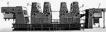 Рис. 4. Четырёхкрасочная листовая офсетная машина ПОЛ-7: 1 — самонаклад; 2 — первая двухкрасочная секция; 3 — вторая двухкрасочная секция; 4 — приёмное устройство.