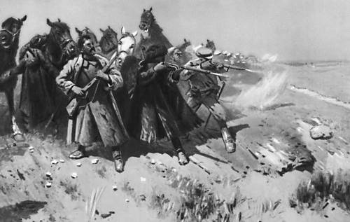 М. Б. Греков. «Отряд Буденного в пешем строю отбивает атаку противника». 1934. Третьяковская галерея. Москва.