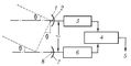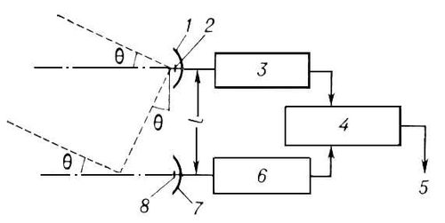 Рис. 2. Схема определения одной угловой координаты объекта методом сравнения фаз: 1 — отражатель 1-й антенны; 2 — облучатель 1-й антенны; 3 — приёмник 1-го канала; 4 — фазометр; 5 — выход к устройству автоматического сопровождения объекта антенной системой; 6 — приёмник 2-го канала; 7 — отражатель 2-й антенны; 8 — облучатель 2-й антенны. Штрихом показано направление прихода сигналов от объекта, штрих-пунктиром — направление максимумов диаграмм направленности антенн.