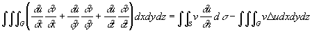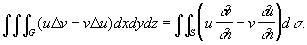Здесь G — область трёхмерного пространства, поверхность S — граница этой области, Du = ¶2u/¶x2 + ¶2u/¶y2 + ¶2u/¶z2 (аналогично Dv) — оператор Лапласа, ¶u/¶n, ¶v/¶n — производные по направлению внешней нормали к S.