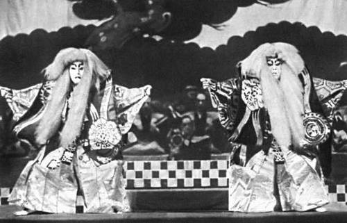 Япония. Сцена из спектакля театра кабуки «Рэндзиси» Каватакэ Мокуами.