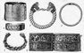 Браслеты: 1 — палеолитический браслет из бивня мамонта (Мезинская стоянка); 2 — древнегреческий браслет (курган Куль-Оба, близ Керчи. 4 в. до н. э.); 3 — древнерусский стеклянный браслет горожанки (11—12 вв.); 4 — древнерусский браслет крестьянки (Новгородские курганы, 14 в.); 5 — волжско-болгарский серебряный браслет (12—14 вв.); 6 — древнерусский браслет знатной женщины, серебро (Владимир. 12 в.).