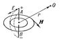 Рис. 3. Структура электрического Е и магнитного H полей вблизи диполя: пунктир — силовые линии электрического поля; тонкие линии — силовые линии магнитного поля; О — точка наблюдения.