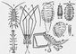 Равноногие ракообразные: 1 — водяной ослик (Asellus aquaticus); 2 — Munnopsis typica; 3 — морской таракан (Mesidothea entomon); 4 — древоточец (Limnoria lignorum); 5 — мокрица (Oniscus asellus); 6 — паразитический рачок ( Bopyroides hippolites; а — самка; б — самец); 7 — Calathura brachiata; 8 — Arcturus baffini.