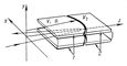 Рис. 3. Электростатическое трансаксиальное электронное зеркало: 1 и 2 — электроды, находящиеся под потенциалами V1 и V2; R — радиус кривизны зазора между электродами; плоскость xz совмещена со средней плоскостью зеркала.