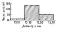 Рис. 2. Гистограмма распределения диаметров 200 деталей. Длина интервала группировки 0,25 мм.