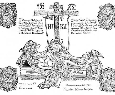 Белорусская ССР. В. М. Вощанка. «Положение во гроб Христа». Гравюра на дереве, напечатанная на холсте (антиминс). 1708.