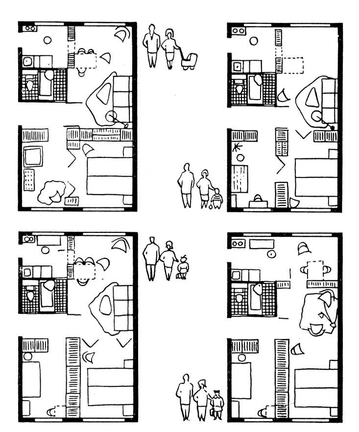 Приём свободной планировки в организации жилища. Экспериментальный дом в 4-м Вятском переулке в Москве. 1962. Архитекторы А. И. Криппа, В. С. Боровой, Е. В. Кавин, инженеры Б. Н. Смирнов и др. Варианты планировки трёхкомнатной квартиры.