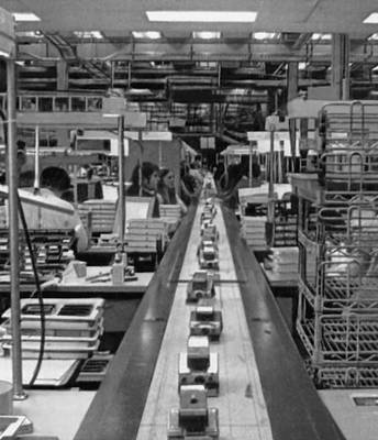 Сборка фотоаппаратов на конвейере предприятия фирмы «Поляроид». в Норвуде (шт. Массачусетс).