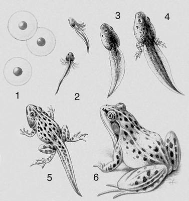 Ðèñ. 4 (VI). Ìåòàìîðôîç ëÿãóøêè: 1 — ÿéöà (èêðà), 2 — ãîëîâàñòèê ñ íàðóæíûìè æàáðàìè, 3 — áåç æàáð, 4 — ñ çàäíèìè íîãàìè, 5 — ñî âñåìè íîãàìè è ñ õâîñòîì, 6 — ëÿãóøêà.