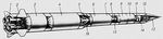 Составная ракета: 1, 5, 8 — жидкостные ракетные двигатели 1-й, 2-й, 3-й ступени; 2 — стабилизатор; 3, 6, 9 — баки горючего 1-й, 2-й, 3-й ступени; 4, 7, 10 — баки окислителя 1-й, 2-й, 3-й ступени; 11 — приборный отсек с аппаратурой системы управления; 12 — полезный груз; 13 — головной обтекатель; 14 — механизм отделения космического объекта; 15 — стык между 2-й и 3-й ступенью; 16 — стык между 1-й и 2-й ступенью.