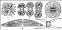 Десмидиевые водоросли: 1 — Xanthidium; 2 — Cosmarium (три последовательные стадии деления клетки); 3 — Micrasterias; 4 — Closterium; 5 — Closterium (образование зиготы).