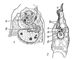 Двойное оплодотворение; 1 — у рябчика: один из спермиев (а) в контакте с ядром яйцеклетки, второй (б) — с одним из полярных ядер (второе полярное ядро не изображено); 2 — у подсолнечника: а — пыльцевая трубка; б — синергиды (одна из них повреждена пыльцевой трубкой); в — яйцеклетка; г — спермий в контакте с ядром яйцеклетки; д — центральная клетка; е — второй спермий в контакте со вторичным ядром зародышевого мешка.