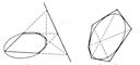 1) Д. п. формулируется в проективной геометрии на плоскости. При этом двойственными понятиями являются, например, «точка» и «прямая», «точка лежит на прямой» и «прямая проходит через точку». Каждой аксиоме в проективной геометрии на плоскости формулируется двойственное предложение, которое может быть доказано с помощью этих же аксиом (этим обосновывается Д. п. в проективной геометрии на плоскости). Двойственными утверждениями в проективной геометрии на плоскости являются известные теоремы Паскаля и Брианшона. Первая из этих теорем утверждает, что во всяком шестивершиннике, вписанном в линию 2-го порядка, точки пересечения противоположных сторон лежат на одной прямой (рис. 1). Вторая теорема утверждает, что во всяком шестистороннике, описанном около линии 2-го порядка, прямые, соединяющие противоположные вершины, пересекаются в одной точке (рис. 2).
