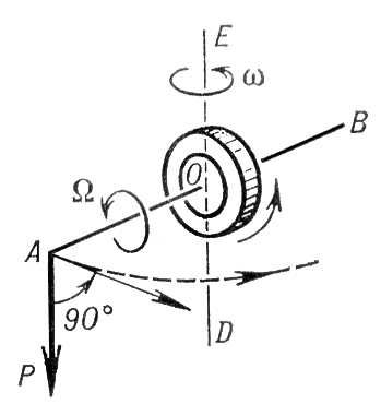 Рис. 4. Правило определения направления прецессии: глядя на ротор из точки приложения силы Р, надо установить, как вращается ротор — по ходу или против хода часовой стрелки. После этого мысленно повернуть вектор АР вокруг оси АВ на 90° в ту же сторону (т. е. по ходу или против хода часовой стрелки соответственно); тогда он и укажет направление прецессии (здесь — AD).