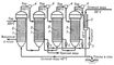 Рис. 2. Схема многоступенчатого дистилляционного опреснителя с трубчатыми нагревательными элементами: 1 — испарительные камеры 1, 2, 3 и 4-й ступеней; 2 — трубчатые нагревательные элементы; 3 — концевой конденсатор; 4 — брызгоулавливатель; 5 — насос.