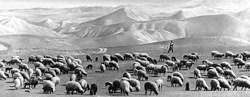 Отара каракульских овец на летних пастбищах.