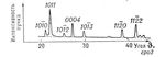 Рис. 2. Рентгенограмма графита, полученная по методу Дебая — Шеррера с помощью ионизационного спектрографа; использовалось монохроматическое Кa-излучение меди (длина волны l = 1,54
